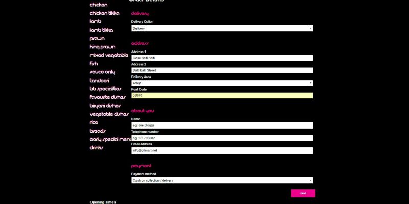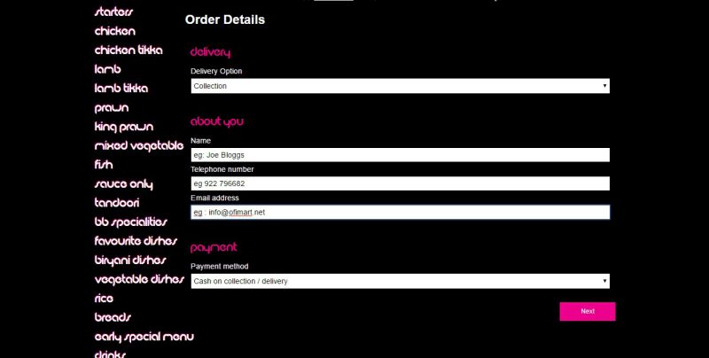 For Delivery fill out your name,address, delivery area, telephone number and email address and click on Next button.